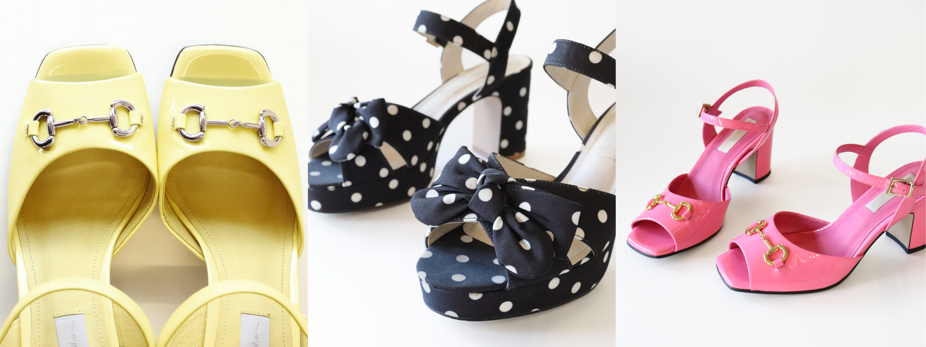 A playful palette of blossom pink, citrus yellow, cream, tan, and pops of summery blue and pink patent injects joyful femininity throughout. Beloved favourites return with vibrant updates.